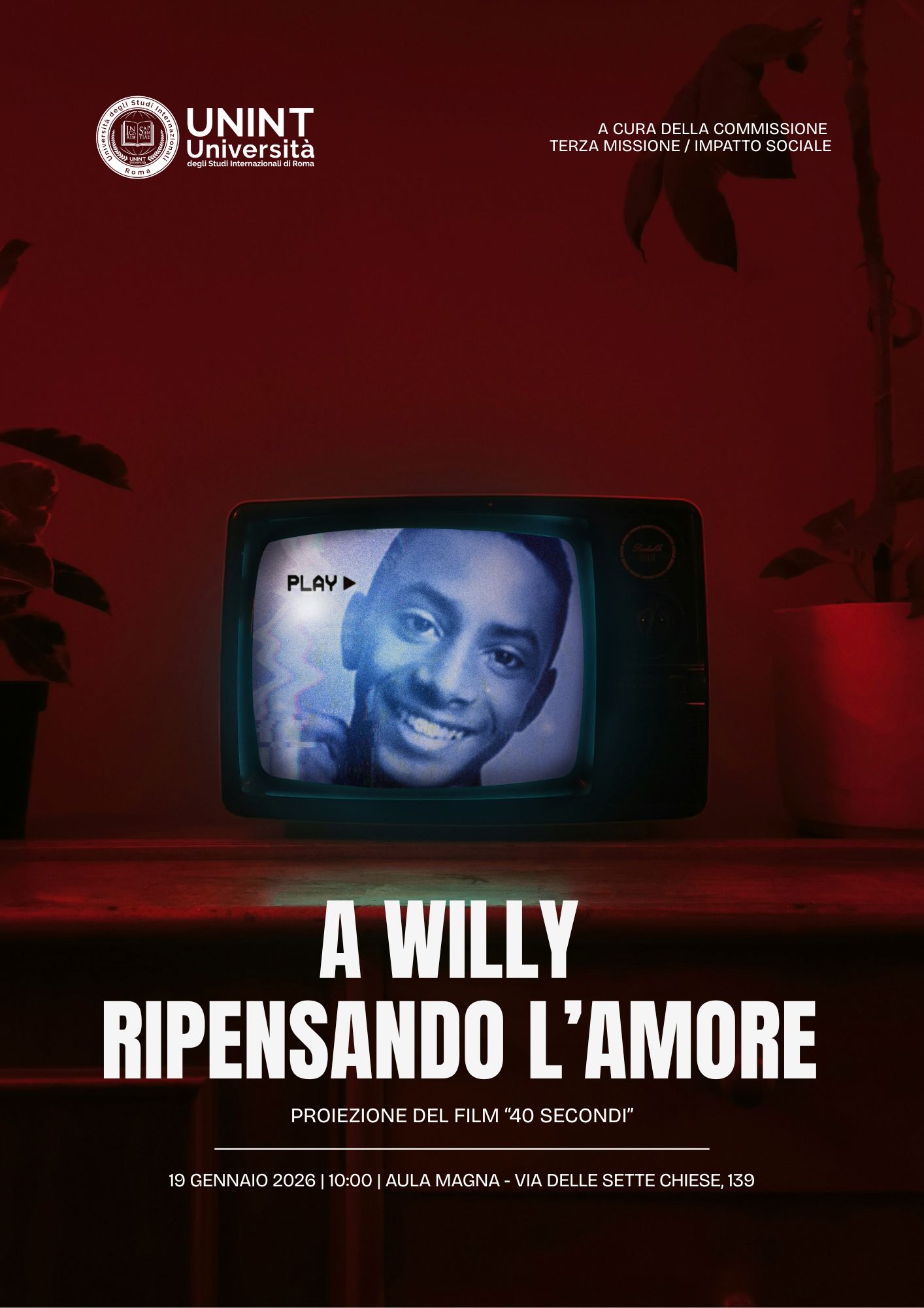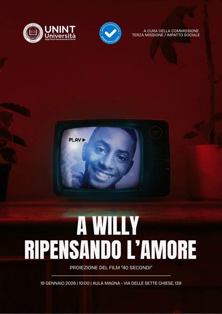 L’Università degli Studi Internazionali di Roma – UNINT organizza un momento di incontro dedicato alla memoria di Willy Monteiro Duarte. L’incontro, dal titolo “A Willy. Ripensando l’amore”, si terrà il 19 gennaio 2026 dalle ore 10:00 in aula magna.