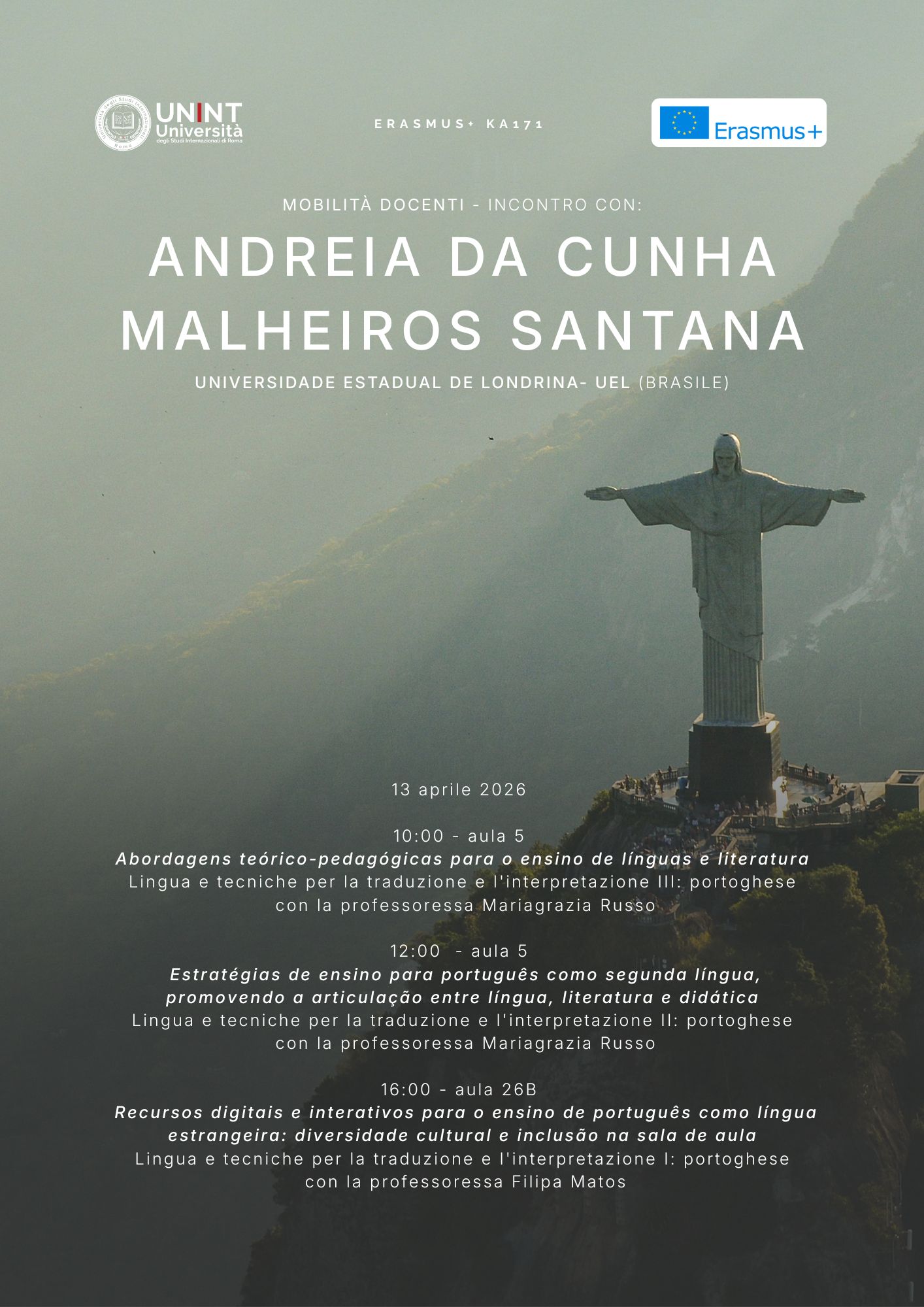 Nell’ambito della mobilità Erasmus+ a fini di insegnamento (Erasmus+ KA171), l’Università degli Studi Internazionali di Roma – UNINT organizza diversi incontri con Andreia Da Cunha Malheiros Santana proveniente dalla Universidade Estadual de Londrina- UEL (Brasile), che si terrano il 13 aprile 2026 in presenza e in live streaming.