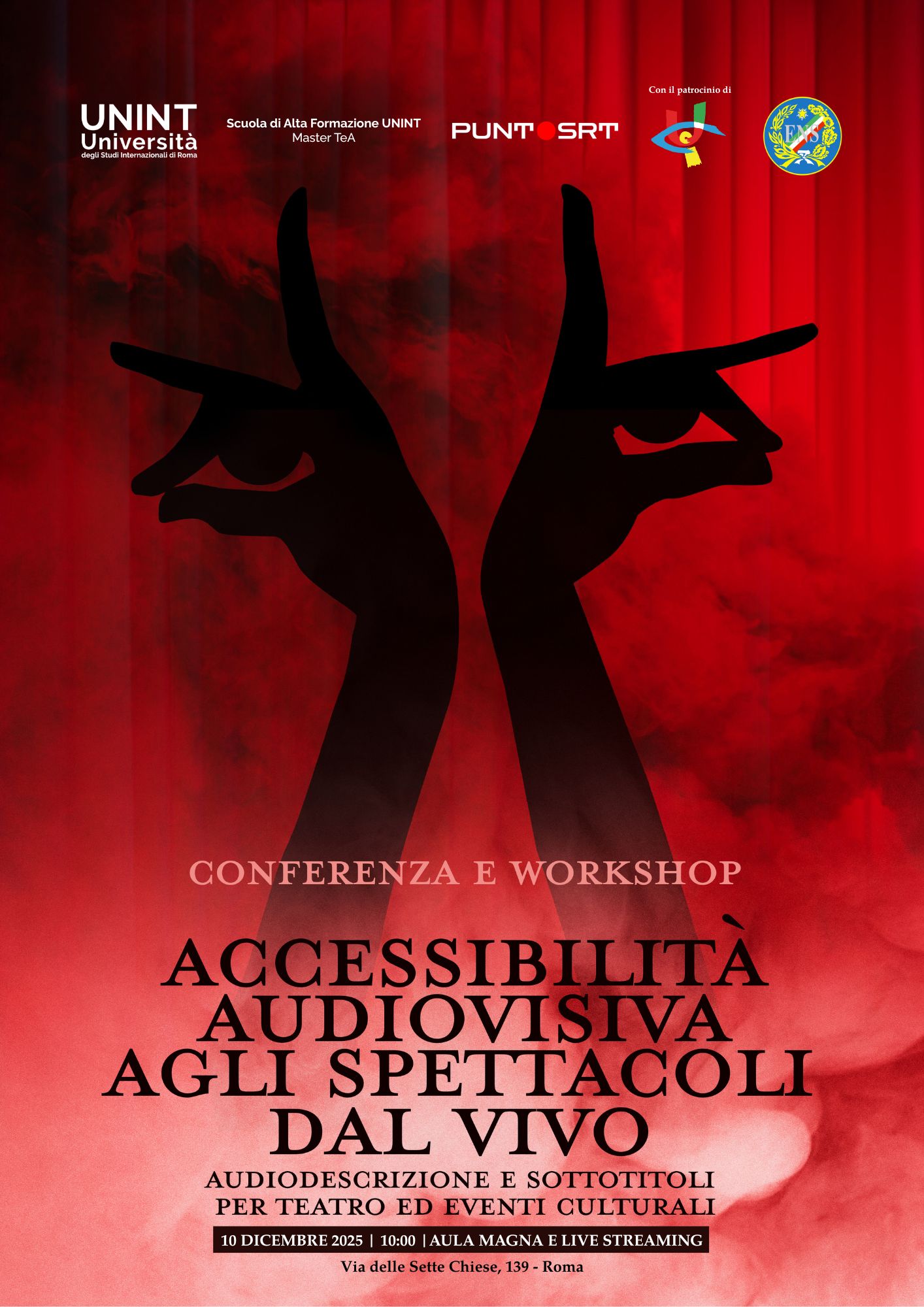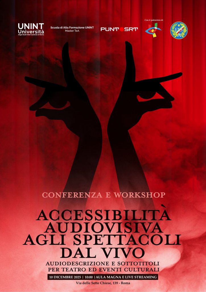 La Scuola di alta formazione UNINT e Puntosrt, nell’ambito delle attività del master universitario di I livello in “Traduzione e adattamento delle opere audiovisive e multimediali per il doppiaggio e il sottotitolo” e con il patrocinio dell’Unione Italiana dei Ciechi e degli Ipovedenti e dell’Ente Nazionale Sordi, organizza l’evento dal titolo “Accessibilità audiovisiva agli spettacoli dal vivo. Audiodescrizione e sottotitoli per teatro ed eventi culturali”.