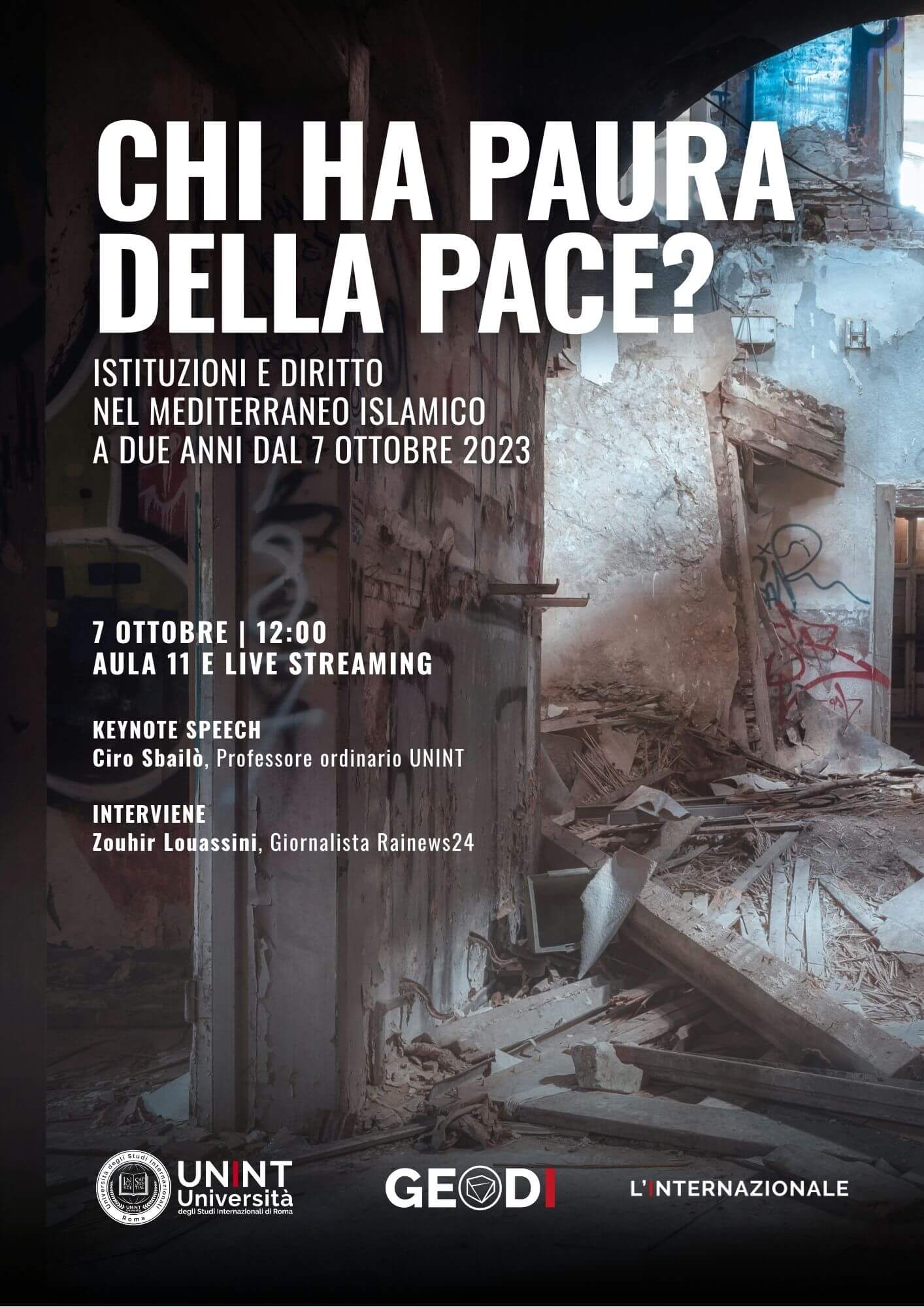 L’Università degli Studi Internazionali di Roma – UNINT in collaborazione con il Centro di ricerca GEODI – Geopolitica, Diritto e Data Intelligence, organizza l’evento dal titolo “Chi ha paura della pace? Istituzioni e diritto nel Mediterraneo islamico a due anni dal 7 ottobre 2023”, che si terrà il 7 ottobre 2025 alle 12:00 in aula 11 e live streaming.