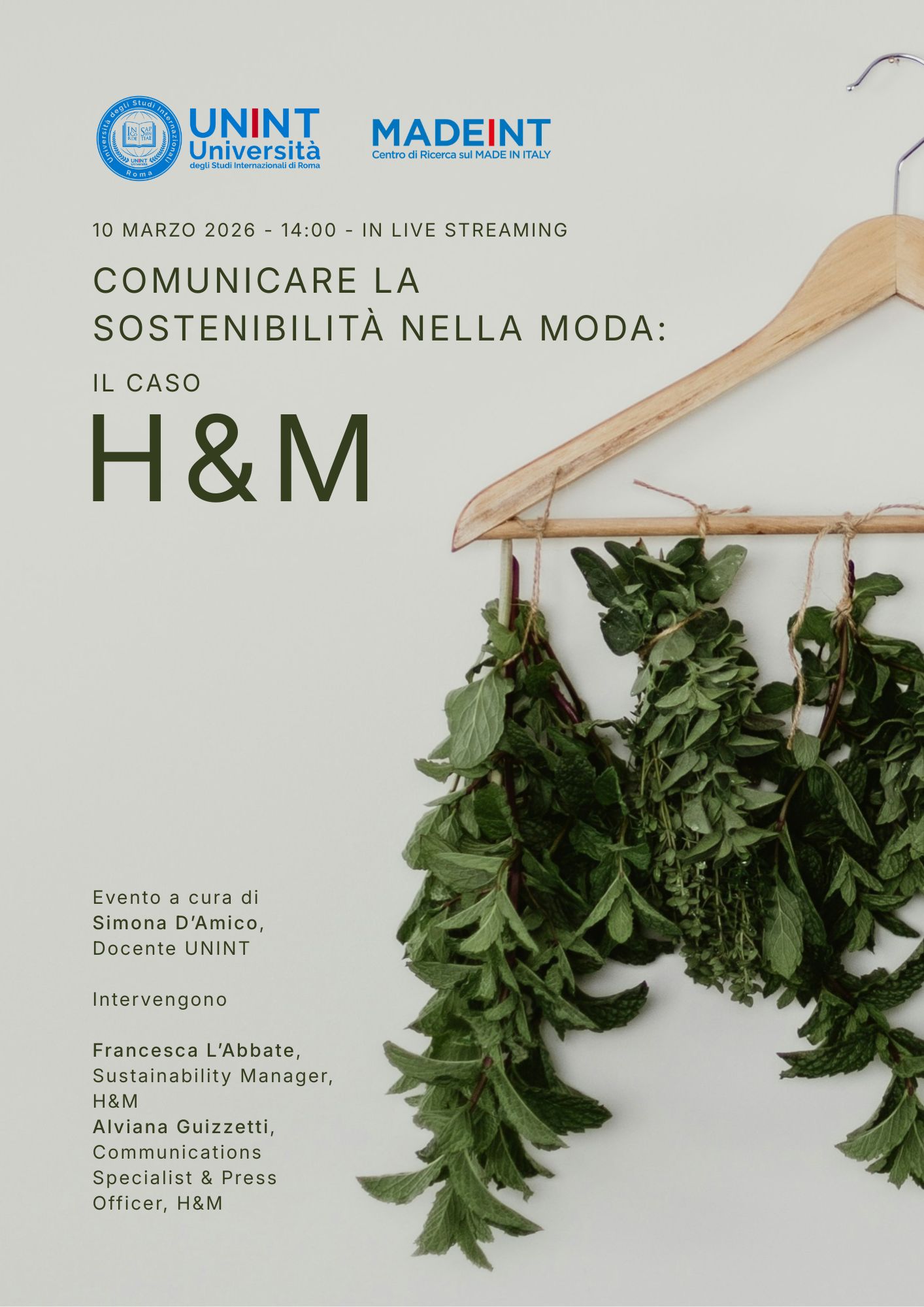 L’Università degli Studi Internazionali di Roma – UNINT organizza l’incontro dal titolo: “Comunicare la sostenibilità nella moda: il caso H&M”, che si terrà il 10 marzo 2026 a partire dalle 14:00 in live streaming.