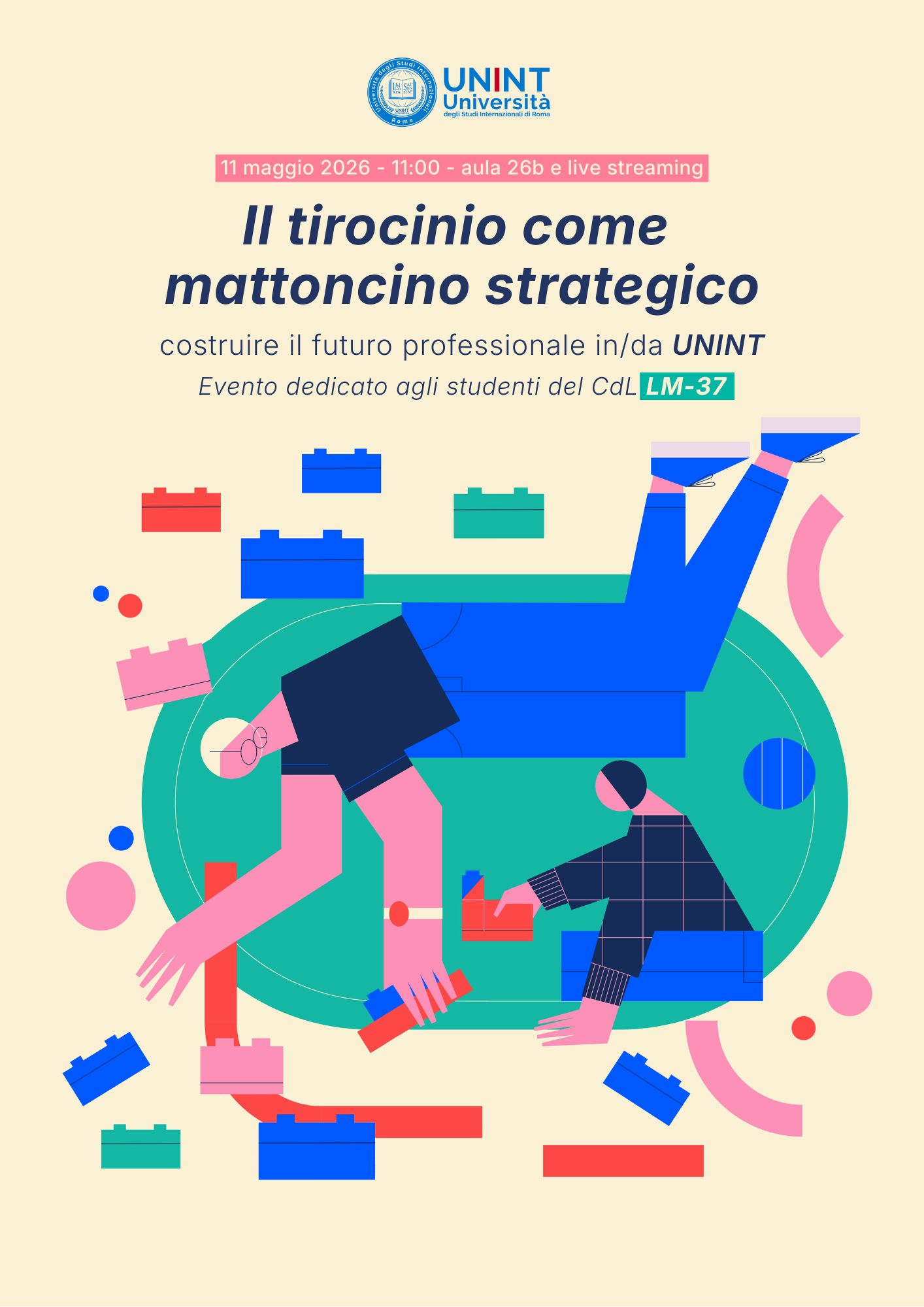 L’Università degli Studi Internazionali di Roma – UNINT, organizza l’evento dal titolo: “Il Tirocinio come mattoncino strategico: costruire il futuro professionale in/da UNINT, che si terrà l’11 maggio 2026 dalle ore 11:00 in aula 26b e live streaming.