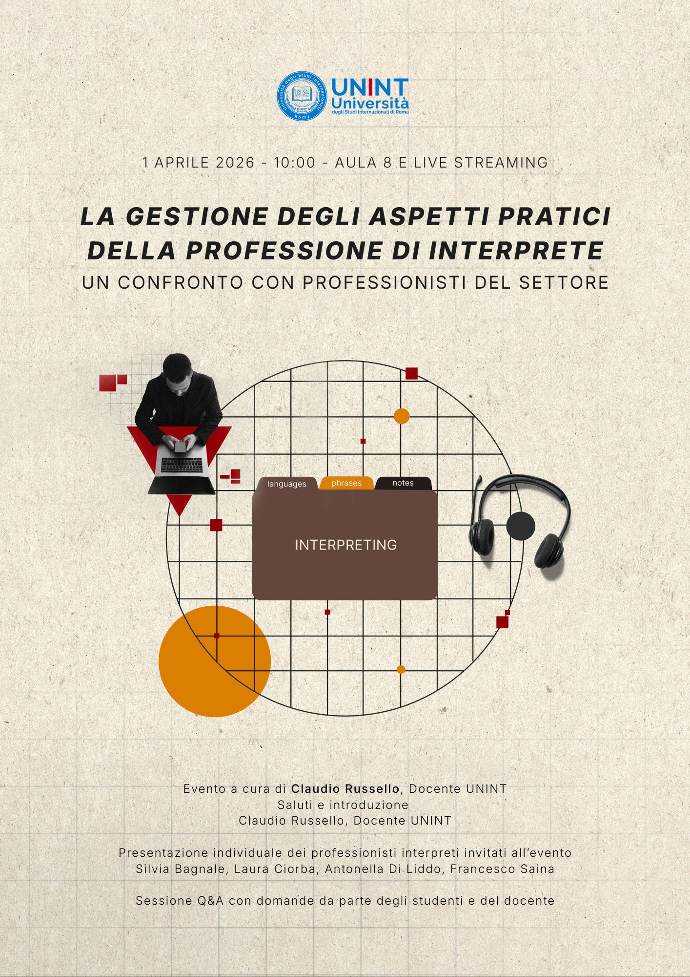 L’Università degli Studi Internazionali di Roma – UNINT organizza l’evento dal titolo “La gestione degli aspetti pratici della professione di interprete: un confronto con professionisti del settore” che si terrà il 1° aprile 2026 dalle ore 10:00 in aula 8 e in live streaming.