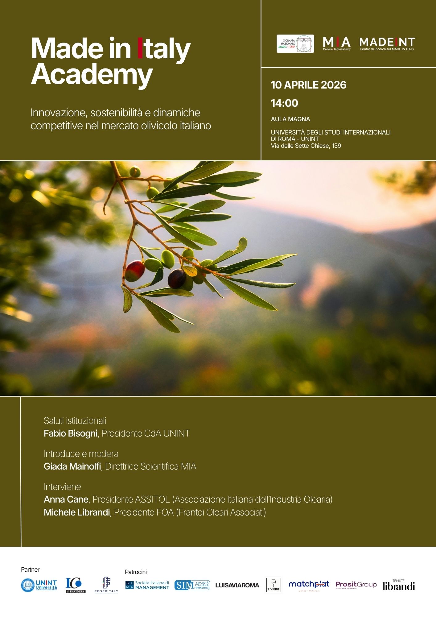 La Made in Italy Academy (MIA) dell’Università degli Studi Internazionali di Roma – UNINT, in occasione della Giornata Nazionale del Made in Italy, presenta l’evento dal titolo “Innovazione, sostenibilità e dinamiche competitive nel mercato olivicolo italiano” che si terrà il 10 aprile 2026 dalle ore 14:00 in aula magna e in live streaming.