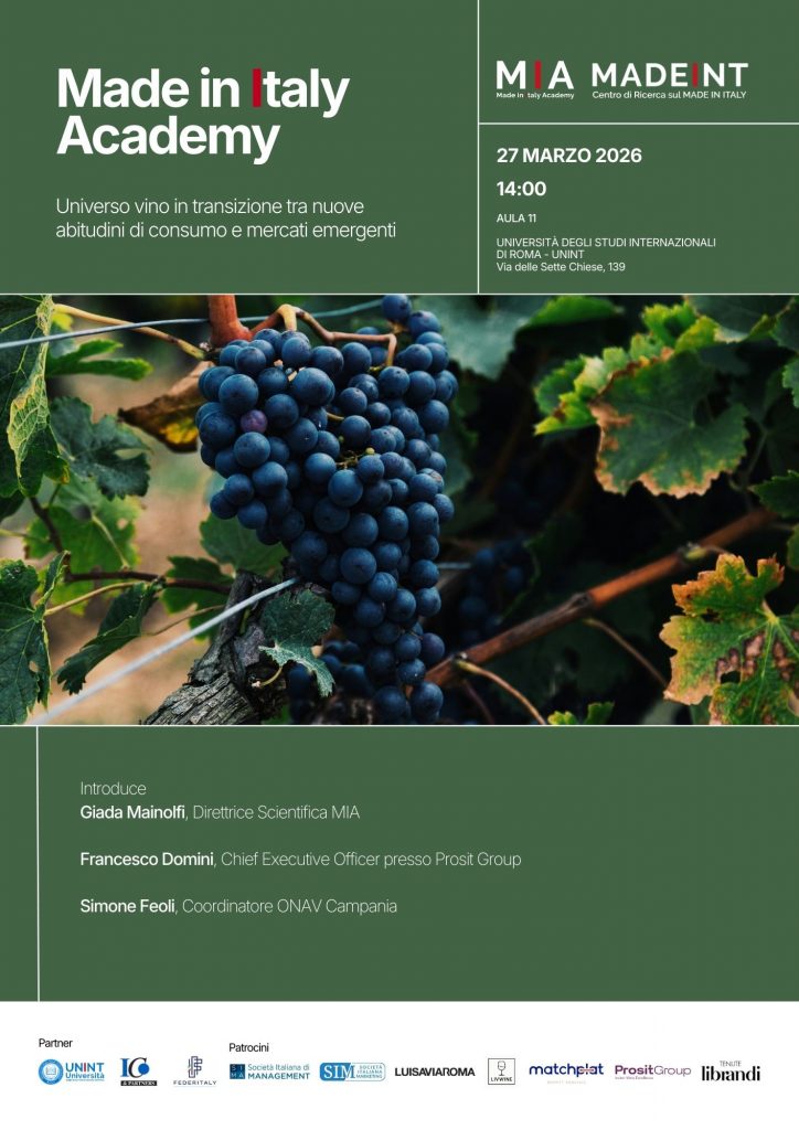 La Made in Italy Academy (MIA) dell’Università degli Studi Internazionali di Roma – UNINT presenta l’evento dal titolo “Universo vino in transizione tra nuove abitudini di consumo e mercati emergenti” che si terrà il 27 marzo 2026 dalle ore 14:00 in aula 11 e in live streaming.