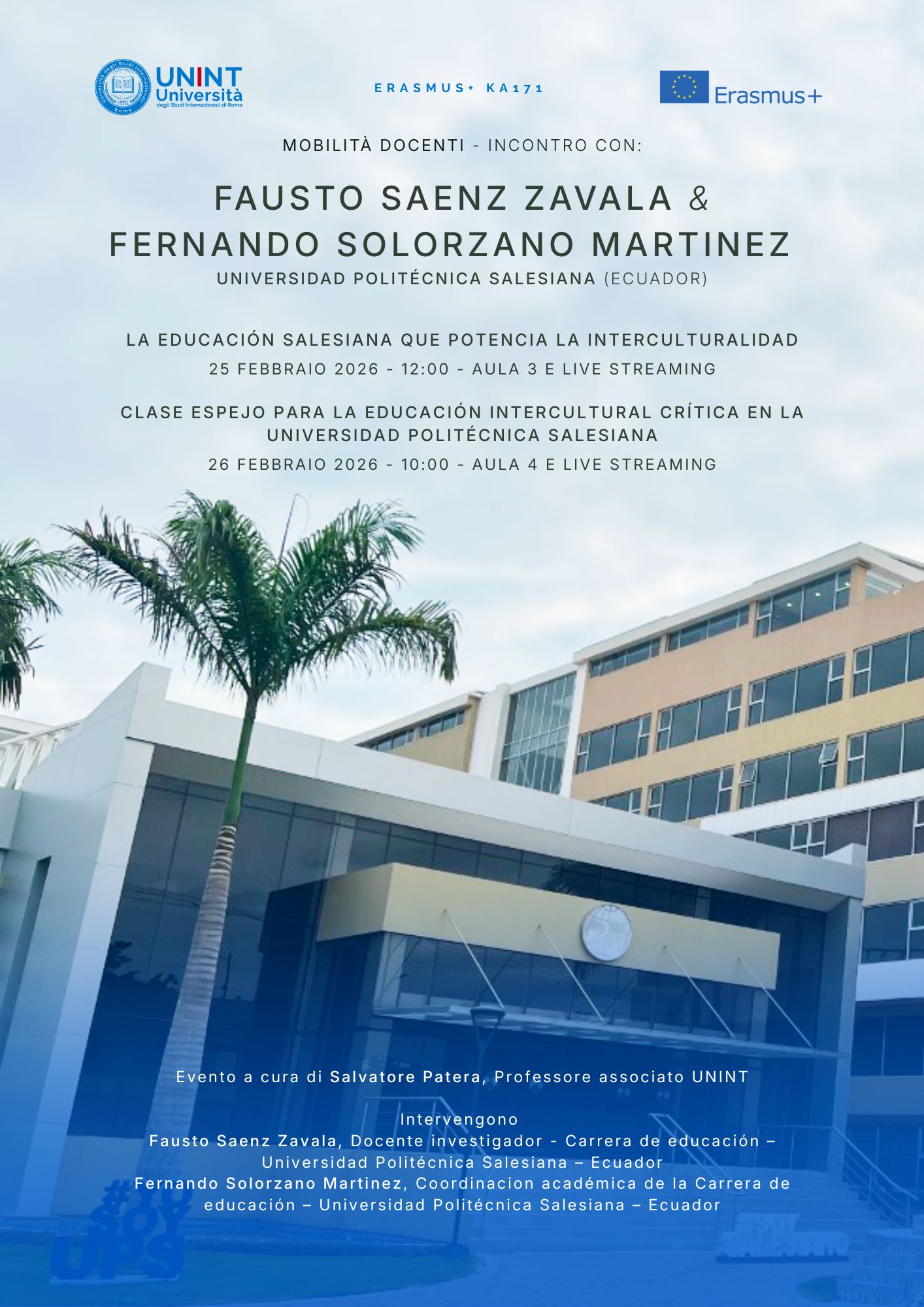 Nell’ambito della mobilità Erasmus+ a fini di insegnamento (Erasmus+ KA171), l’Università degli Studi Internazionali di Roma – UNINT organizza due incontri con Fausto Saenz Zavala e Fernando Solorzano Martinez dalla Universidad Politécnica Salesiana (Ecuador), che si terrano il 25 e 26 febbraio 2026 in presenza e in live streaming.