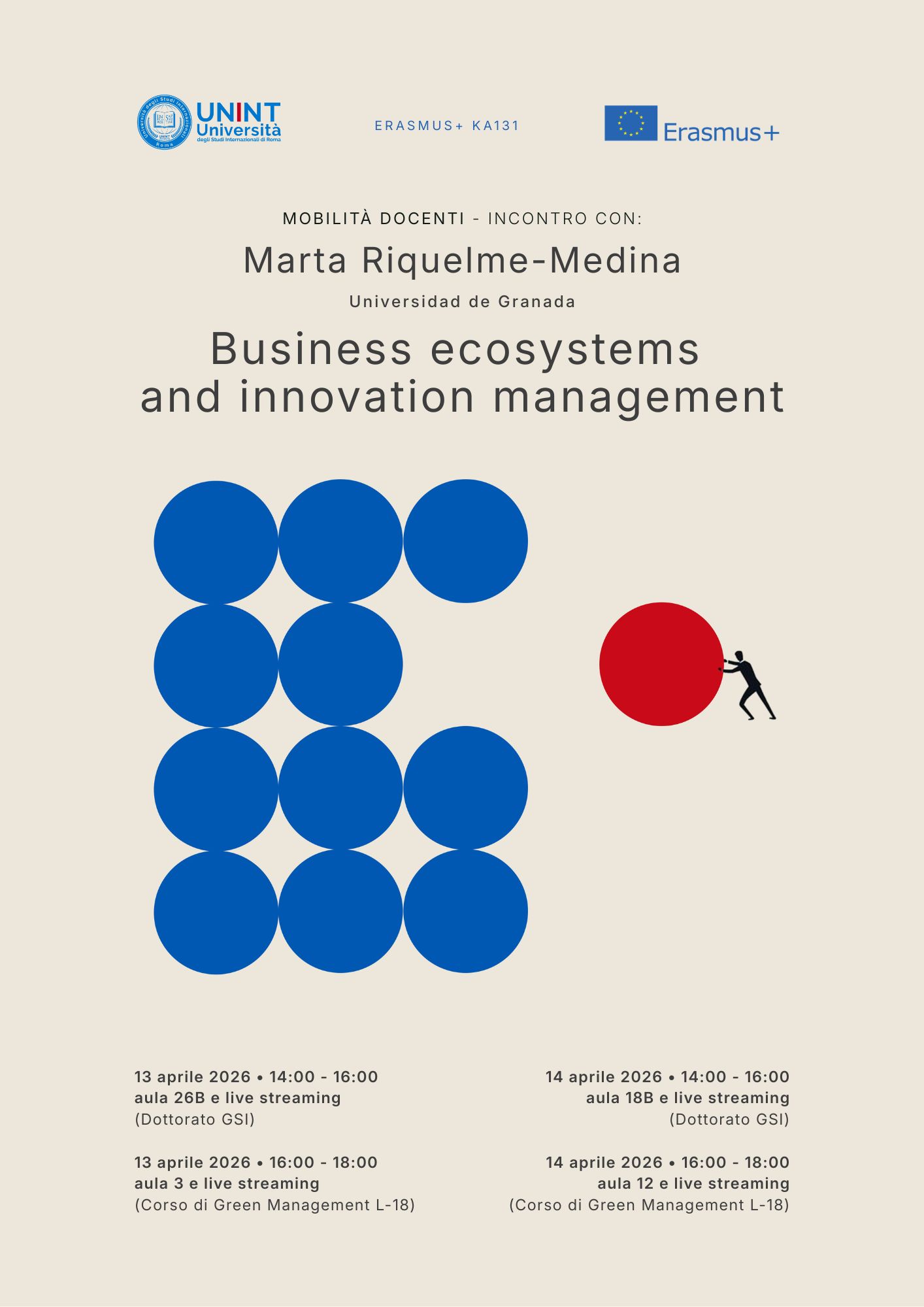 Nell’ambito della mobilità Erasmus+ a fini di insegnamento (Erasmus+ KA131), l’Università degli Studi Internazionali di Roma – UNINT organizza quattro incontri con Marta Riquelme-Medina dalla Universidad de Granada (Spagna), che si terrano il 13 e il 14 aprile 2026 in presenza e in live streaming.