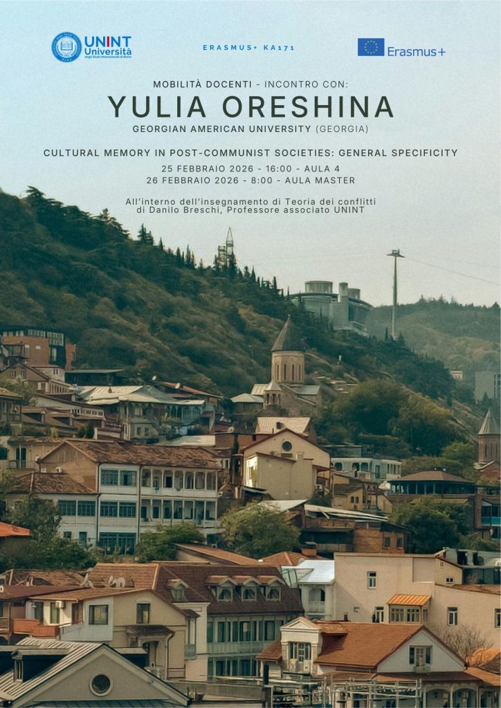 Nell’ambito della mobilità Erasmus+ a fini di insegnamento (Erasmus+ KA171), l’Università degli Studi Internazionali di Roma – UNINT organizza due incontri con Yulia Oreshina dalla Georgian American University (Georgia), che si terrano il 25 e 26 febbraio 2026 in presenza e in live streaming.