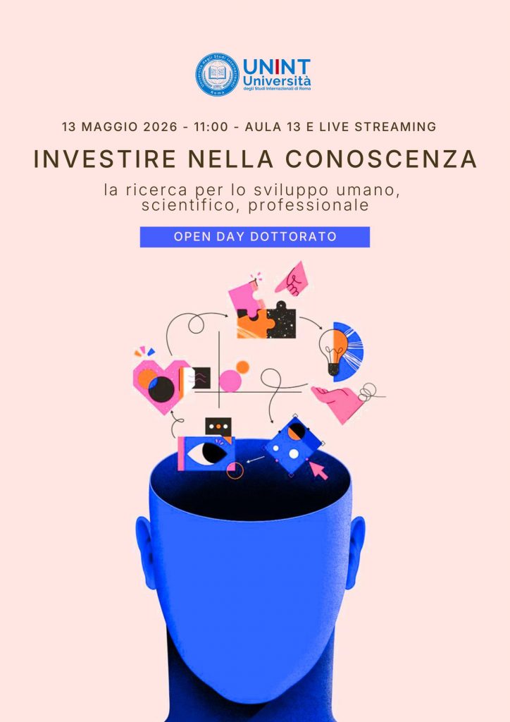 L’Ufficio Dottorati dell’Università degli Studi Internazionali di Roma – UNINT organizza l’Open Day Dottorato, dal titolo: “Investire nella conoscenza: la ricerca per lo sviluppo umano, scientifico, professionale” che si terrà il 13 maggio 2026 a partire dalle ore 11:00 in aula 13 e in live streaming.