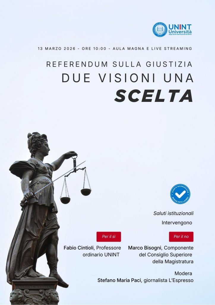 L’Università degli Studi Internazionali di Roma – UNINT organizza l’evento dal titolo “Referendum sulla Giustizia. Due visioni una scelta”, che si terrà il 13 marzo 2026 a partire dalle ore 10:00 in aula magna e in live streaming.