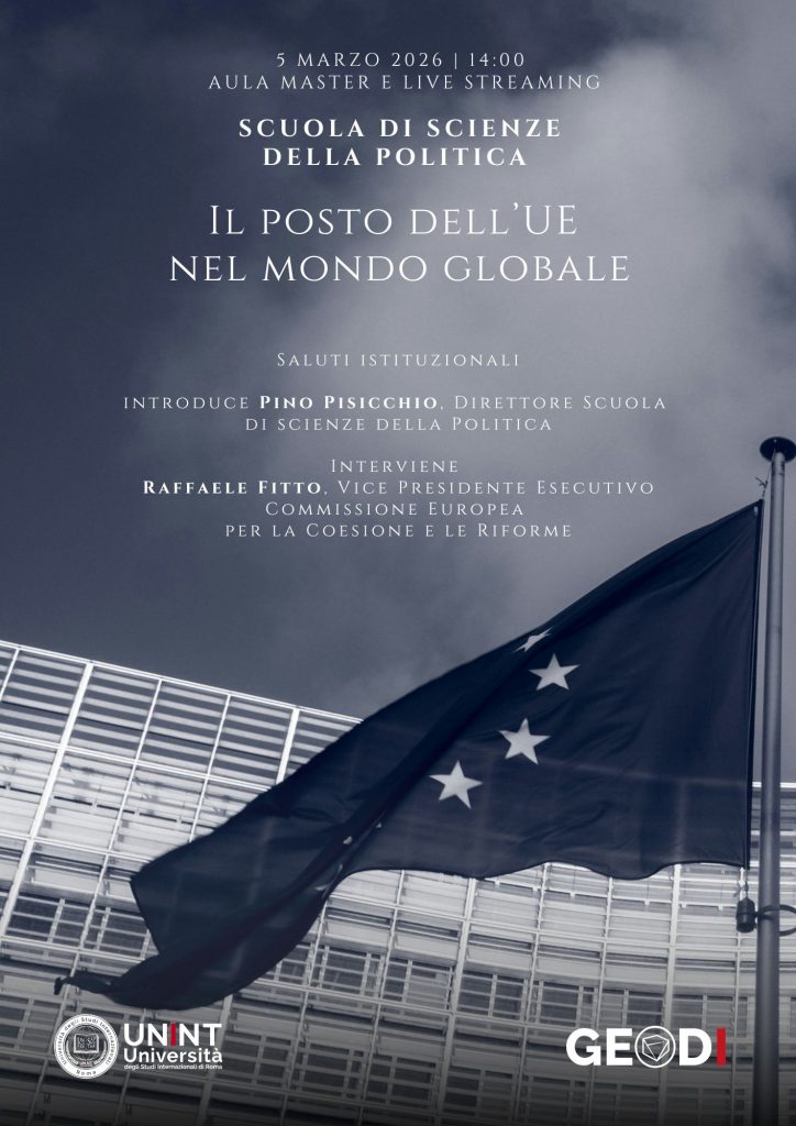 La Scuola di scienze della politica dell’Università degli Studi Internazionali di Roma – UNINT, in collaborazione con il Centro di ricerca GEODI, organizza l’evento dal titolo “Il posto dell’UE nel mondo globale”, che si terrà il 5 marzo 2026 dalle ore 14:00 in aula master e live streaming.