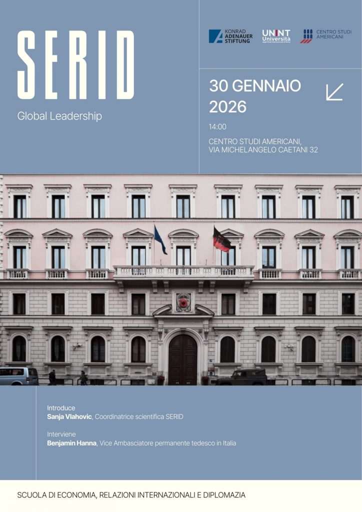 La Scuola di Economia, Relazioni Internazionali e Diplomazia (SERID) dell’Università degli Studi Internazionali di Roma – UNINT, giunta alla sua IV edizione, presenta l’evento dal titolo “Global Leadership”, che si terrà il 30 gennaio 2026 dalle ore 14:00 presso il Centro Studi Americani, in Via Michelangelo Caetani 32.