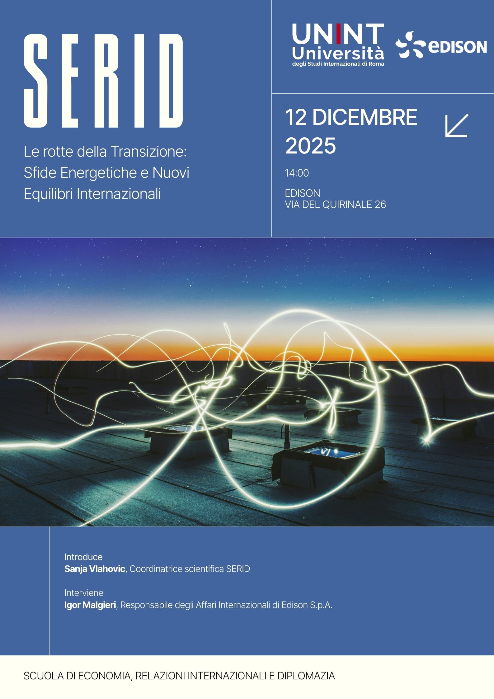 La Scuola di Economia, Relazioni Internazionali e Diplomazia (SERID) dell’Università degli Studi Internazionali di Roma – UNINT, giunta alla sua IV edizione, presenta l’evento dal titolo “Le rotte della transizione: sfide energetiche e nuovi equilibri internazionali”, che si terrà il 12 dicembre 2025 dalle ore 14:00 presso la sede Edison, Via del Quirinale 26 Roma.