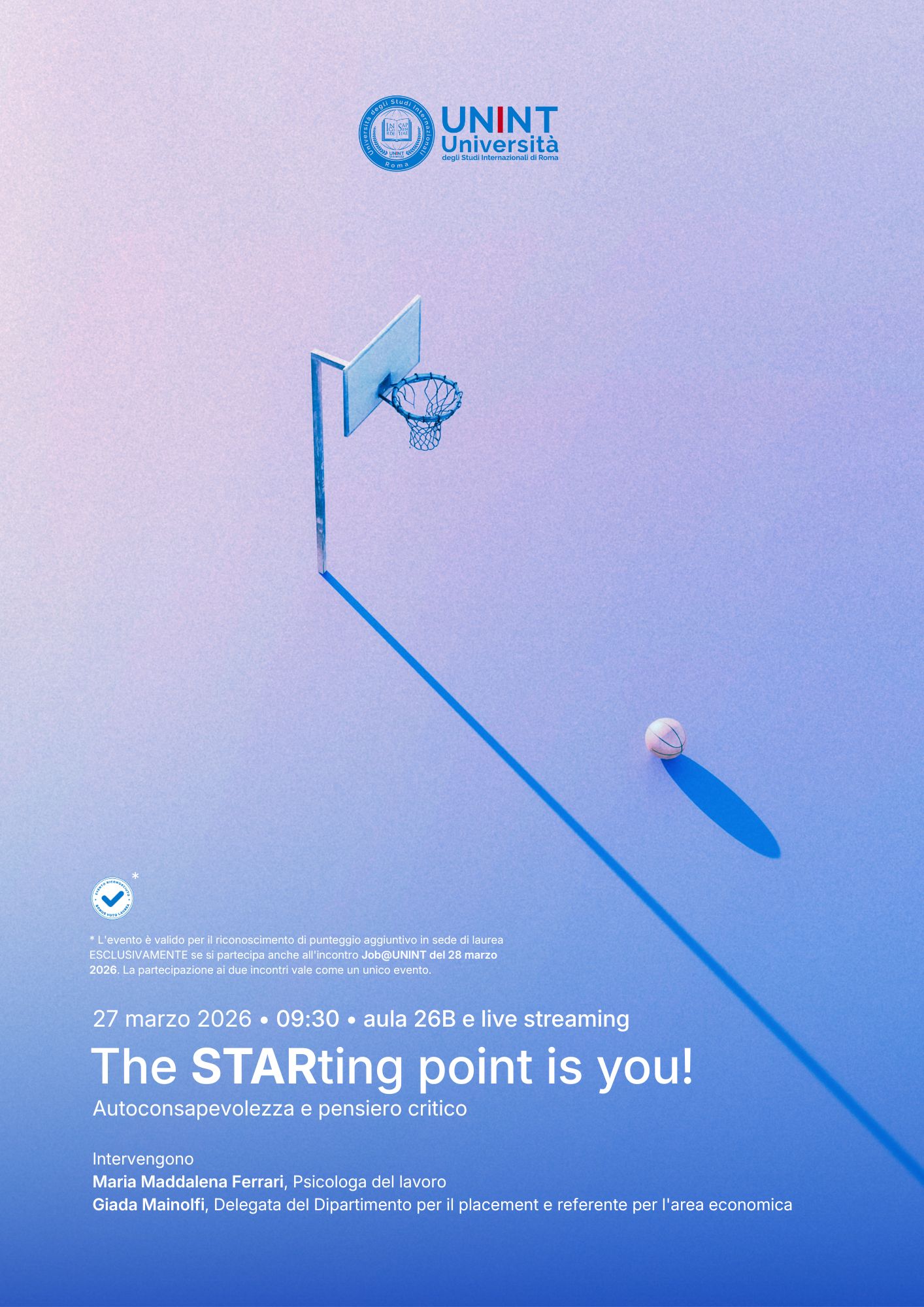 L’evento è valido per il riconoscimento di punteggio aggiuntivo in sede di laurea ESCLUSIVAMENTE se si partecipa anche all’incontro Job@UNINT del 28 marzo 2026. La partecipazione ai due incontri vale come un unico evento.