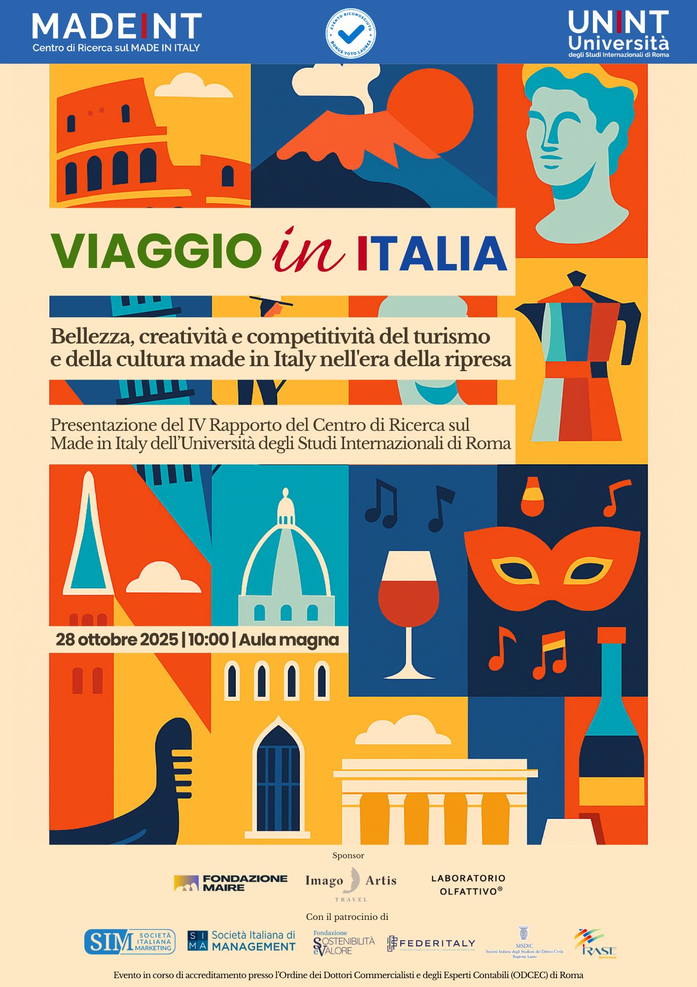 L’Università degli Studi Internazionale di Roma – UNINT organizza l’evento dal titolo Viaggio in Italia. Bellezza, creatività e competitività del turismo e della cultura made in Italy nell’era della ripresa – Presentazione del IV rapporto del Centro di Ricerca sul Made in Italy MADEINT dell’Università degli Studi Internazionali di Roma – UNINT. L’evento si terrà il 28 ottobre 2025 a partire dalle ore 10:00 in aula magna.